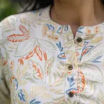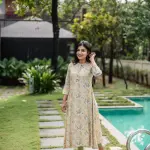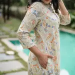 This graceful beige Anarkali-style kurti is adorned with a vibrant leaf and floral print in earthy tones, making it a refreshing choice for casual outings and gatherings. Crafted from soft, breathable fabric, this kurti provides a comfortable fit with a flowy silhouette that enhances its charm. The mandarin collar and buttoned front detail add an element of sophistication, while the three-quarter sleeves and flared cut provide a relaxed and stylish look. The midi length is ideal for pairing with leggings, creating a balanced and elegant outfit.