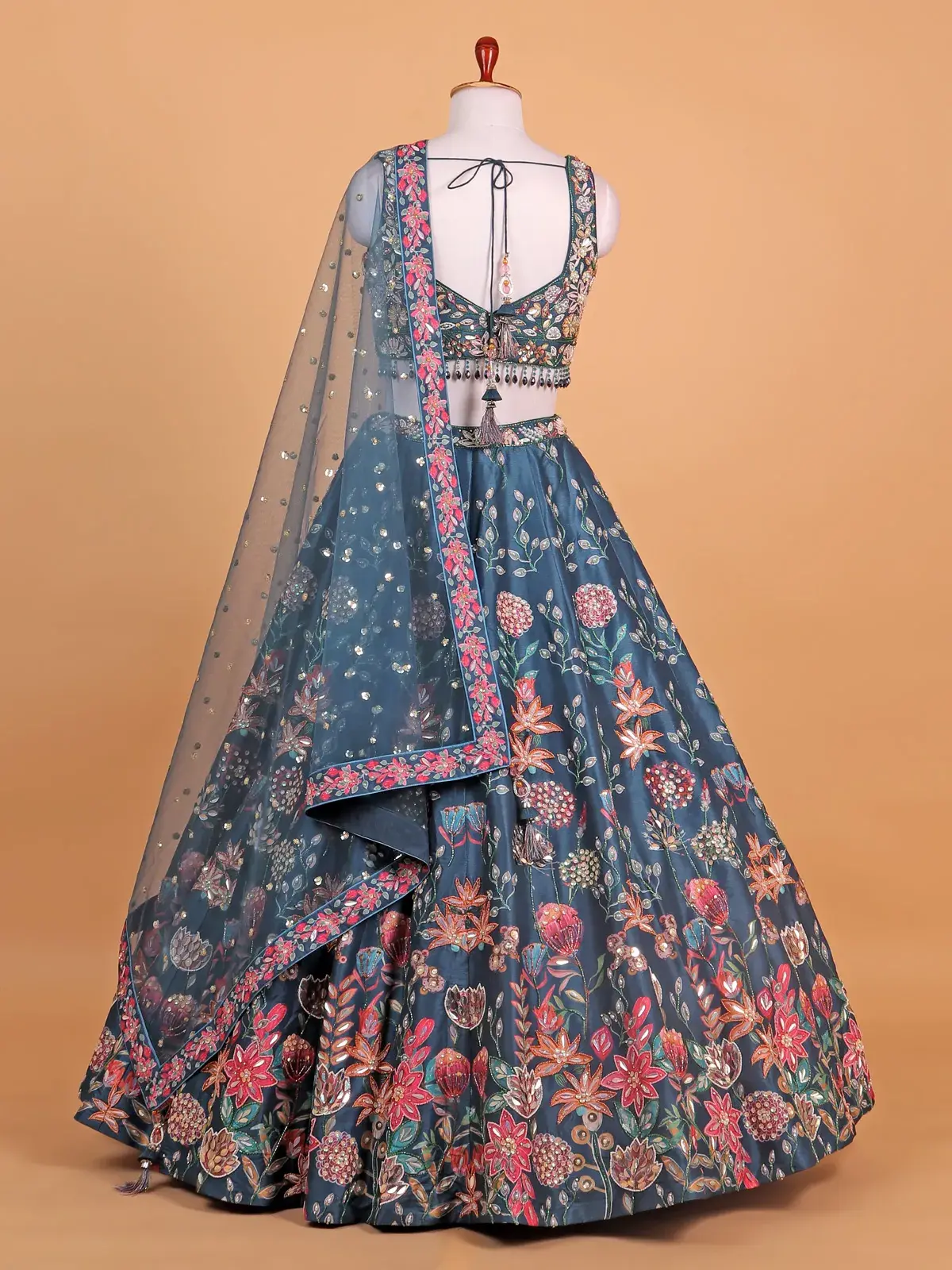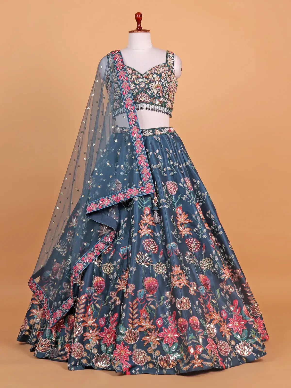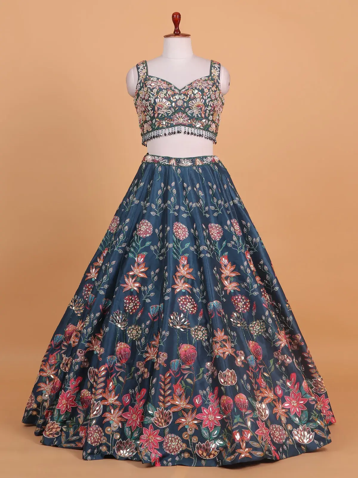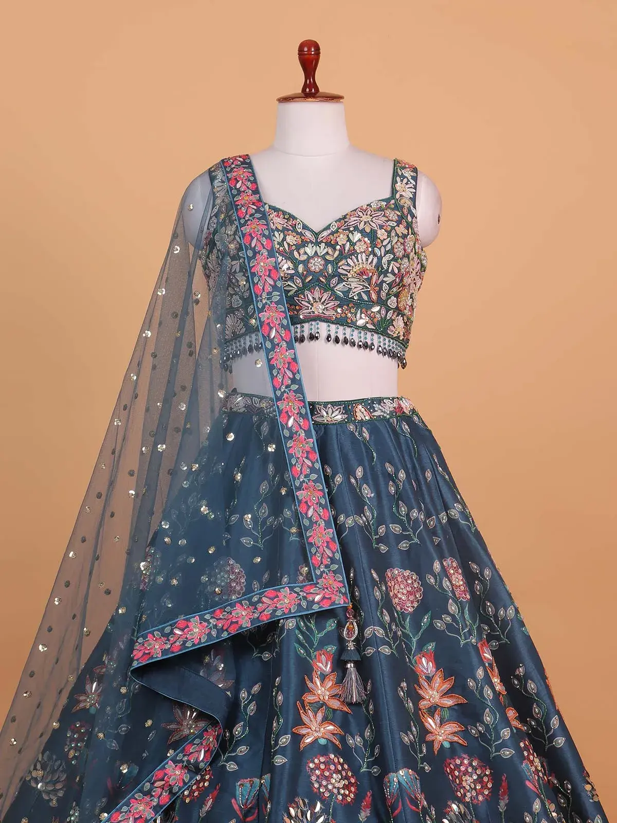 This attractive printed Blue lehenga choli is a perfect fusion of comfort and style. It is designed in silk fabric with beads, diamonds, cutdana, sequins, pearls and stone work. Features a sweetheart neckline and sleeveless choli and comes with a suitable dupatta.