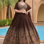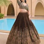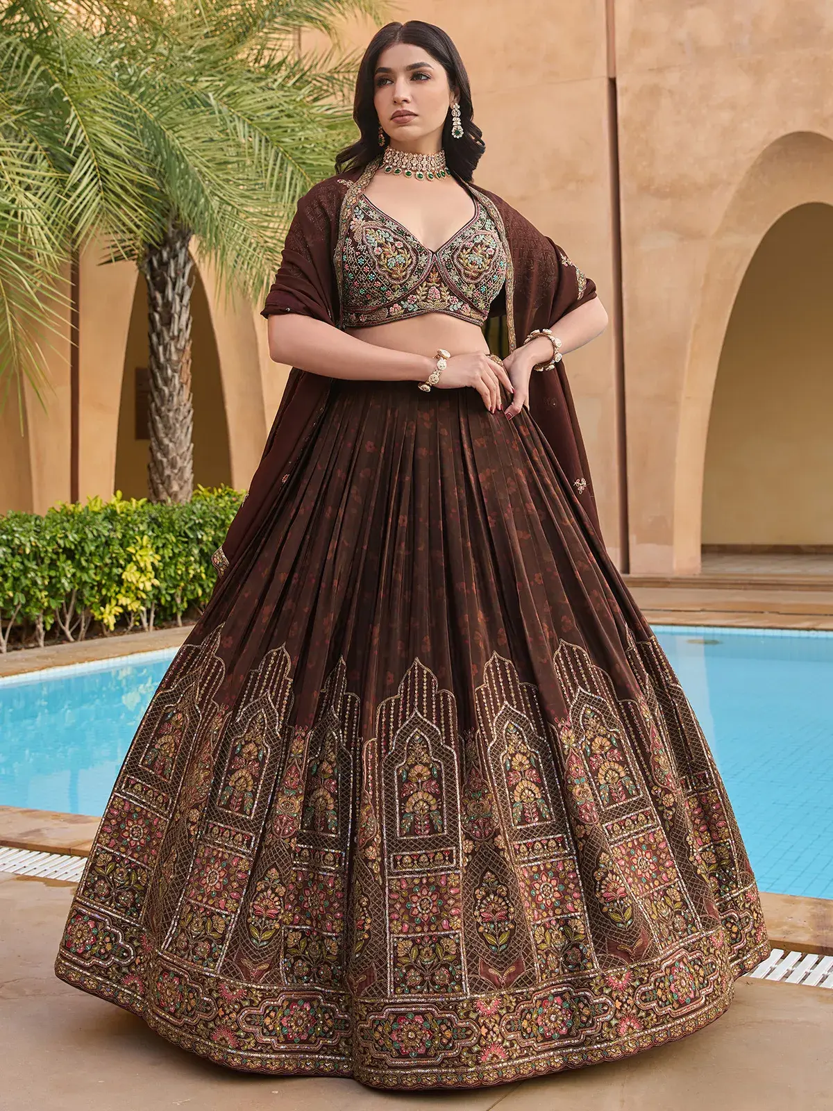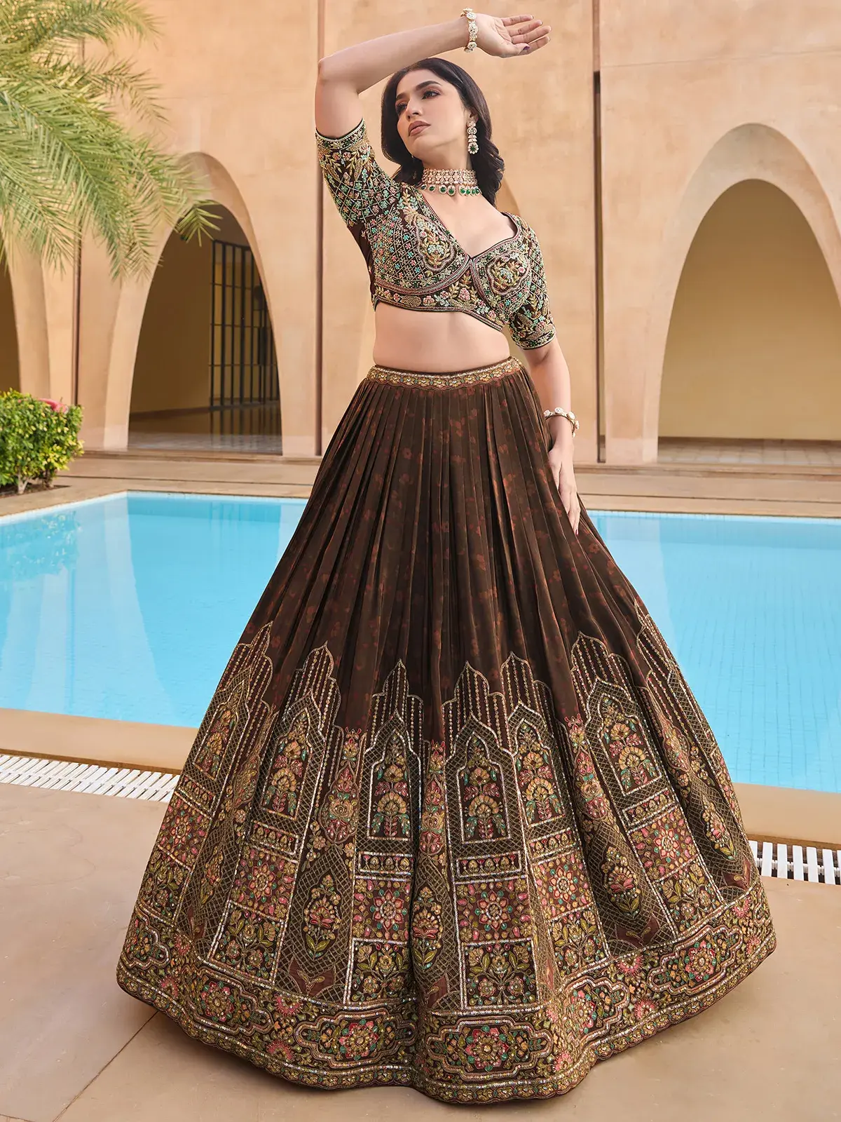 This striking lehenga choli in brown is crafted in silk to make it lightweight and give it the perfect pick for wedding and reception. Enhanced with sumptuous work in cutdana, zardosi, thread, beads, resham, sequins and zari work, features a sweetheart neck and half sleeves.