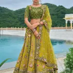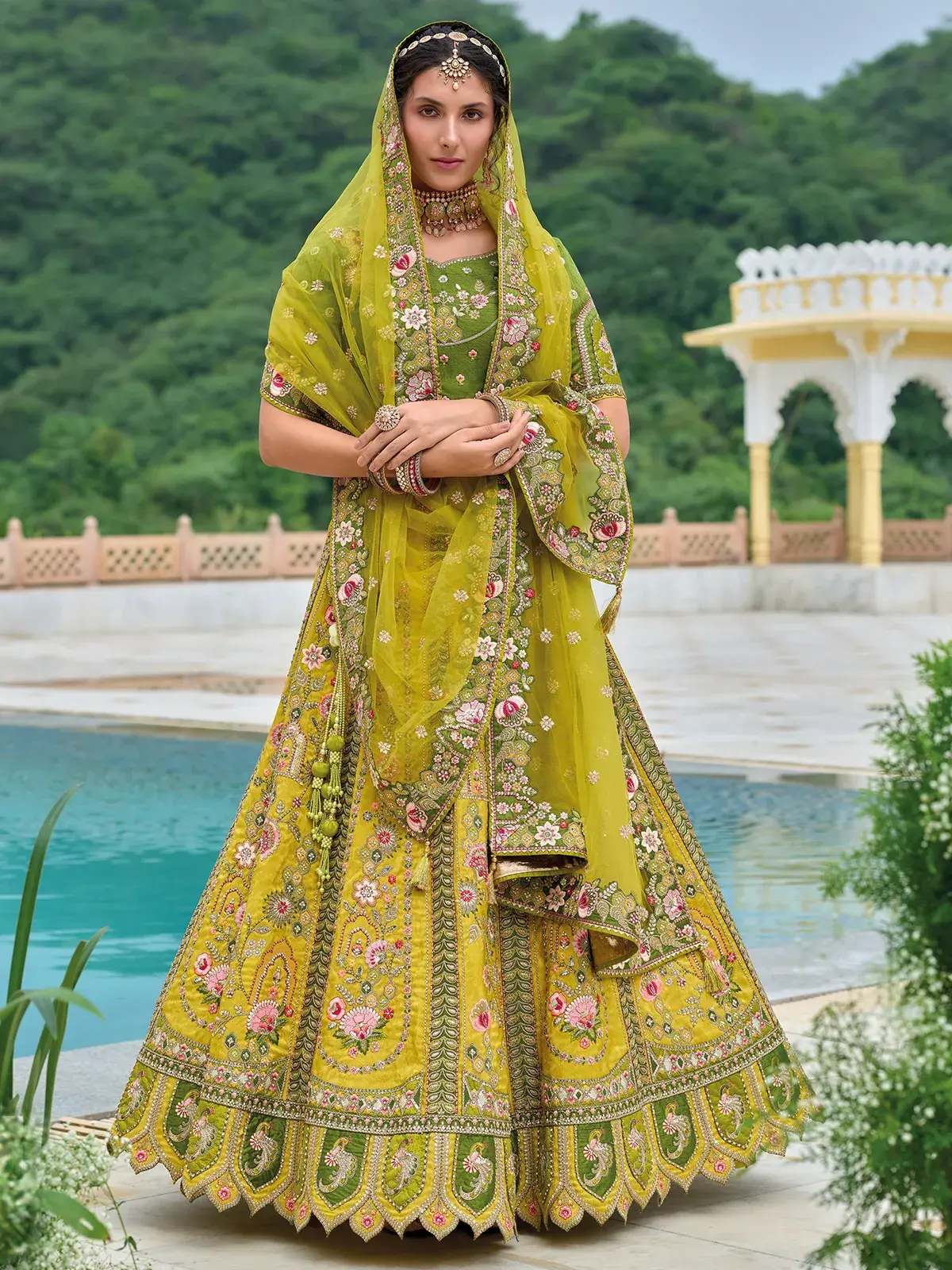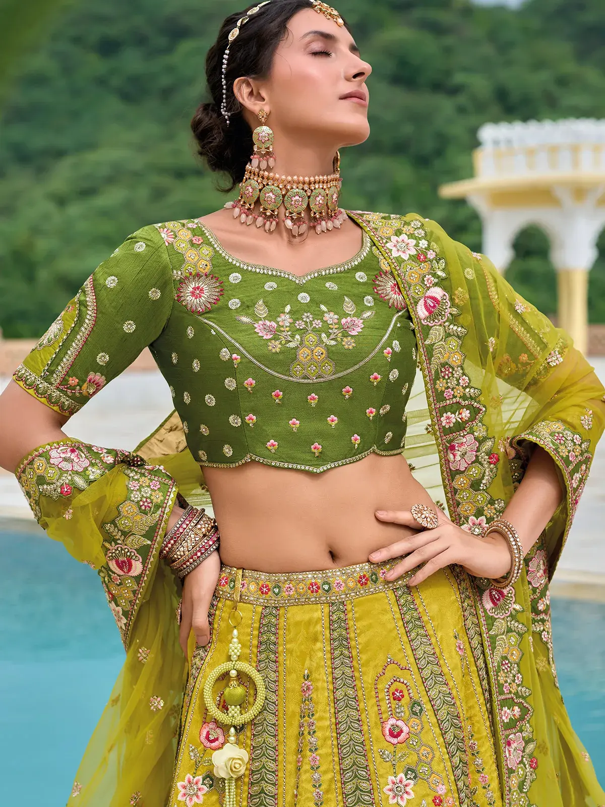Be the center of attention with this mehendi green silk unstitched lehenga choli, showcasing detailed embroidery, resham, sequins, stone, zari and gota work embellishments. Perfect for a wedding, it includes an unstitched choli and a dupatta.