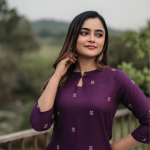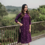 A rich purple kurti exuding elegance and sophistication. The straight-cut design with three-quarter sleeves and side slits make it a versatile outfit, perfect for both formal and casual wear.