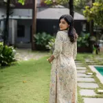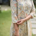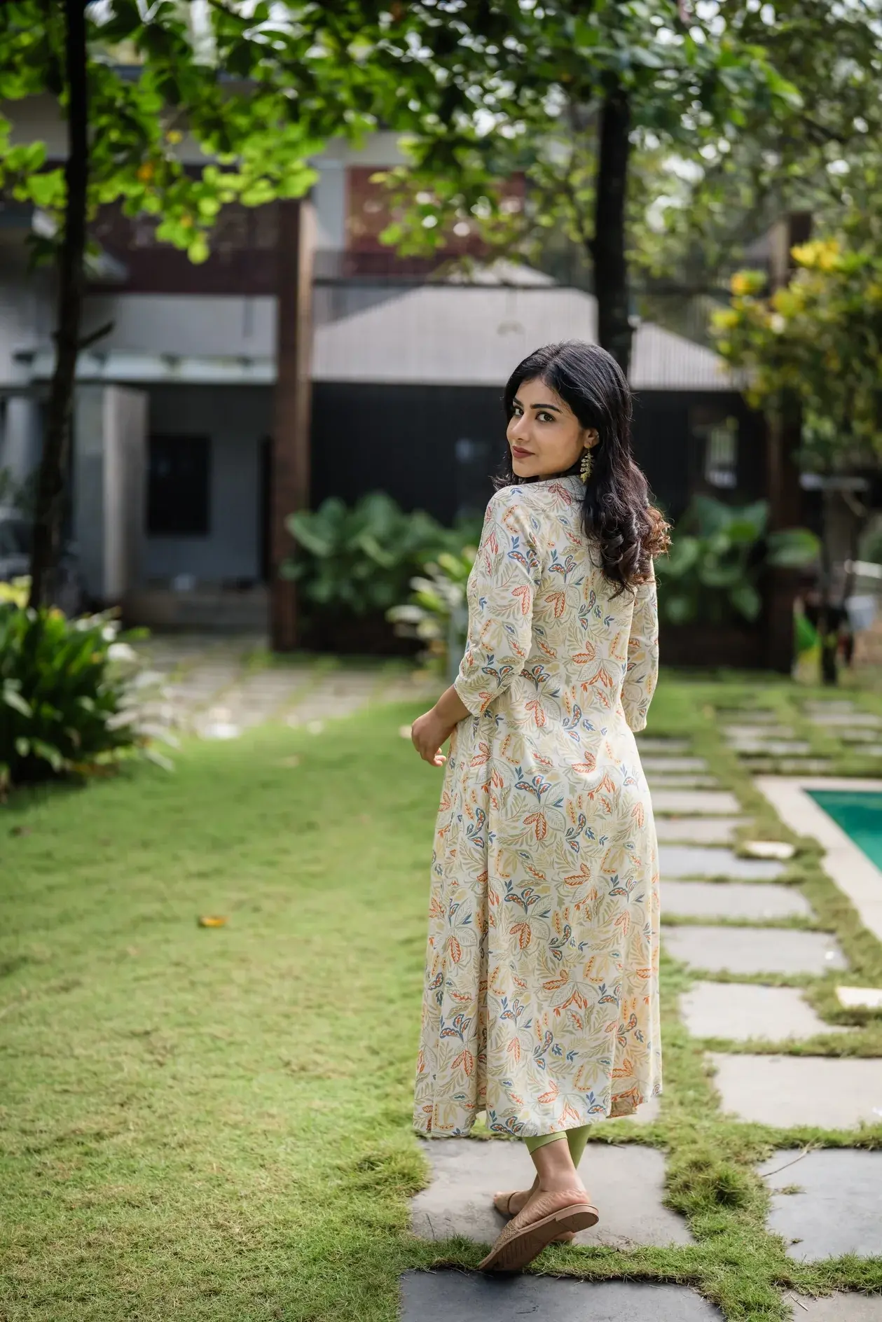 This graceful beige Anarkali-style kurti is adorned with a vibrant leaf and floral print in earthy tones, making it a refreshing choice for casual outings and gatherings. Crafted from soft, breathable fabric, this kurti provides a comfortable fit with a flowy silhouette that enhances its charm. The mandarin collar and buttoned front detail add an element of sophistication, while the three-quarter sleeves and flared cut provide a relaxed and stylish look. The midi length is ideal for pairing with leggings, creating a balanced and elegant outfit.