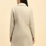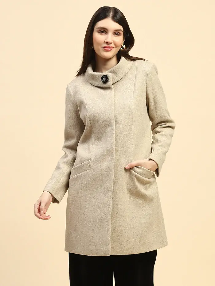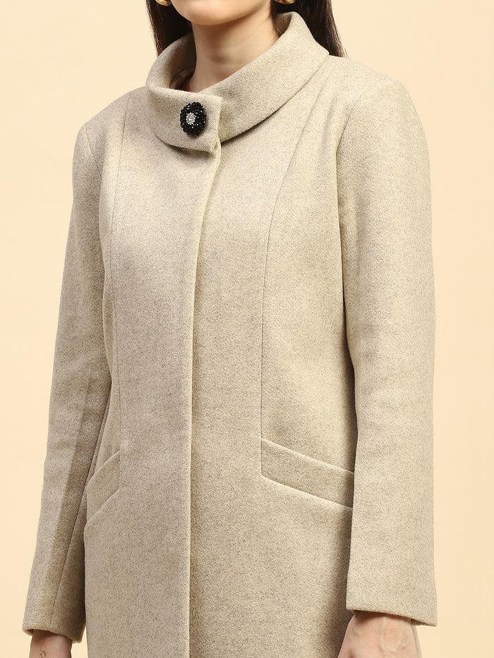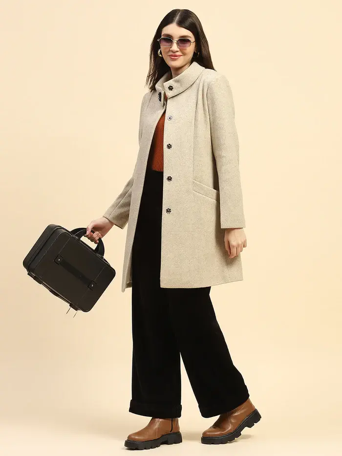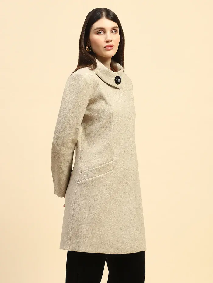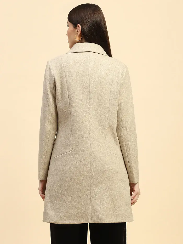 Beige Melange Solid Poly Blend Relaxed Fit Long Coat
