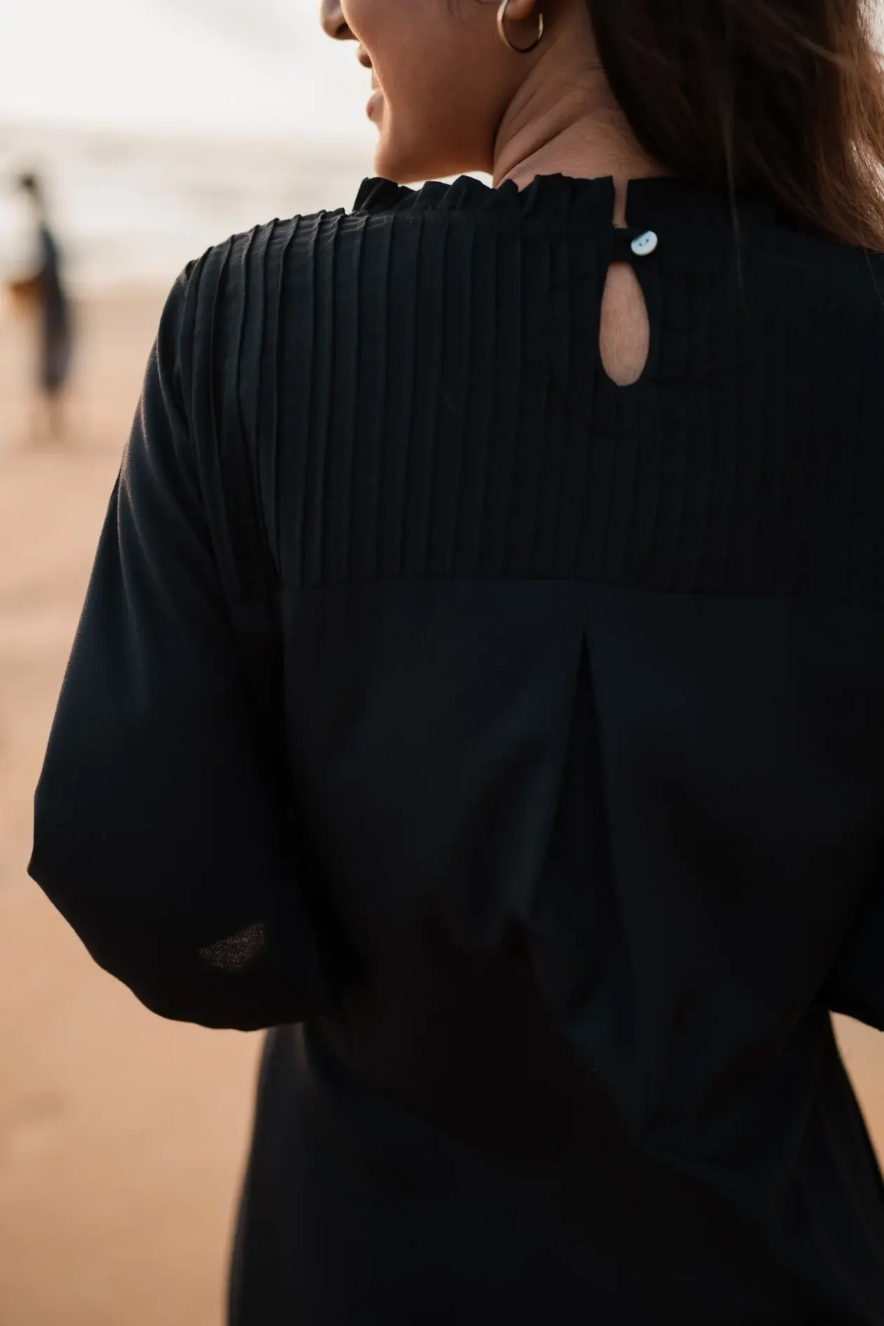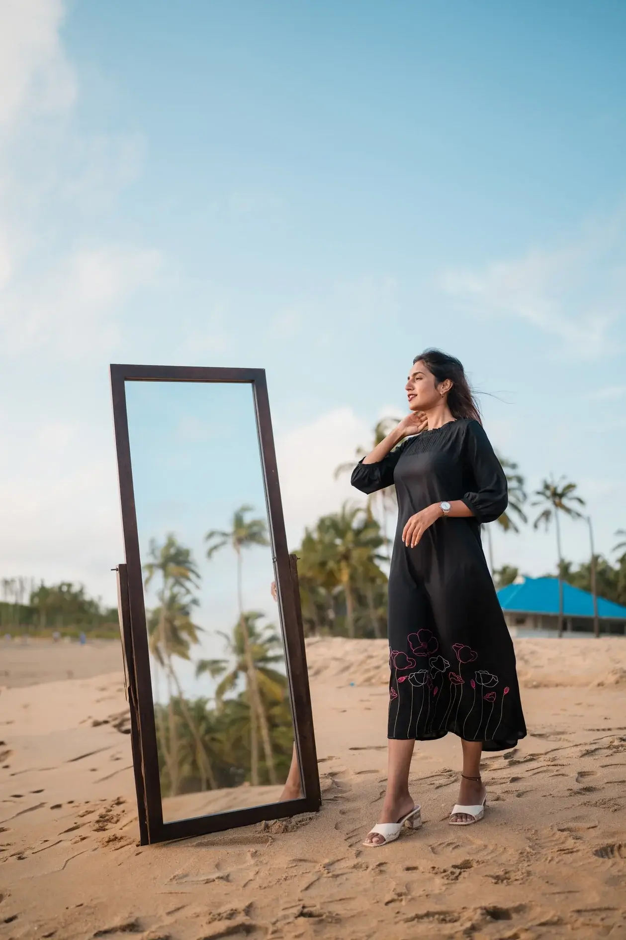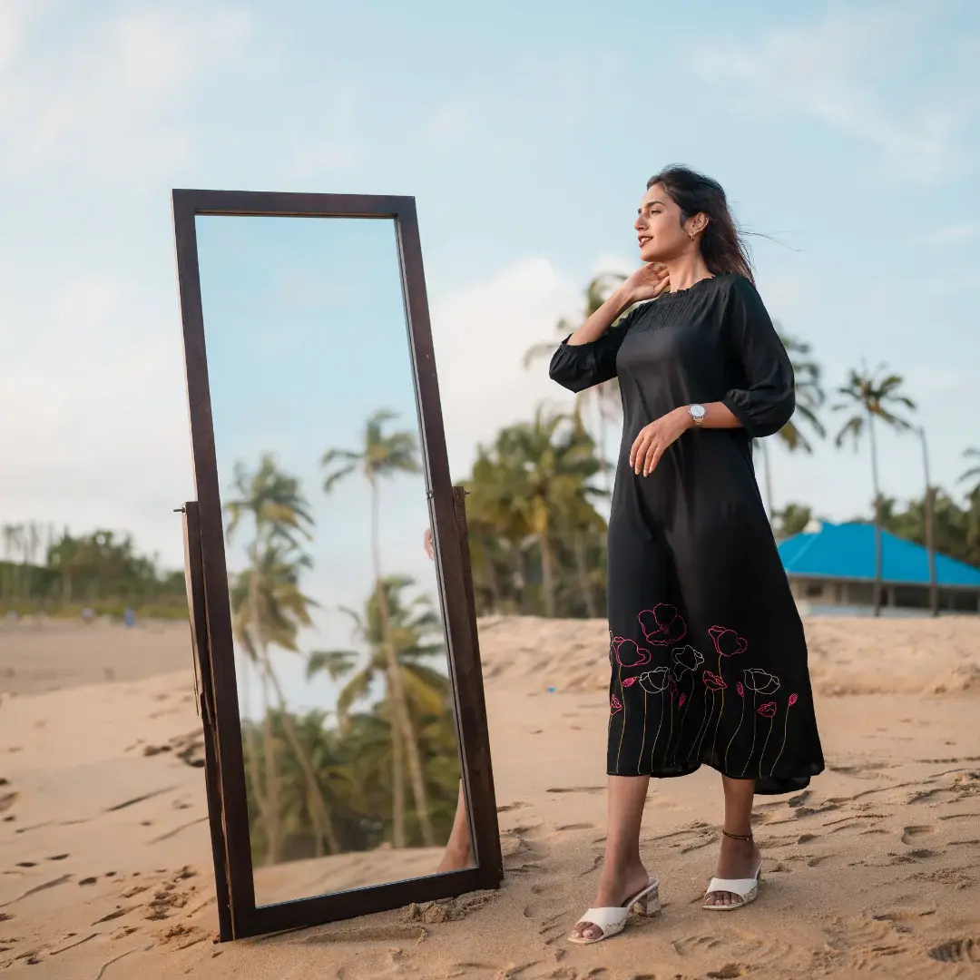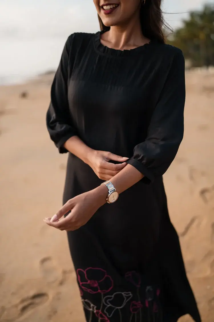An effortlessly elegant addition to your wardrobe, this black midi dress combines timeless design with modern flair. Made from premium lightweight fabric, it’s perfect for breezy days and warm evenings. The delicately embroidered hem with floral motifs adds a splash of color and artistic charm, while the relaxed fit ensures comfort and ease of movement. This versatile dress is ideal for casual outings, beach vacations, and daytime events.