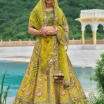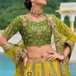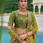 Be the center of attention with this mehendi green silk unstitched lehenga choli, showcasing detailed embroidery, resham, sequins, stone, zari and gota work embellishments. Perfect for a wedding, it includes an unstitched choli and a dupatta.