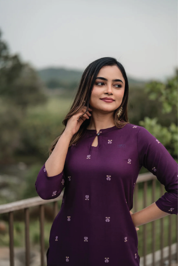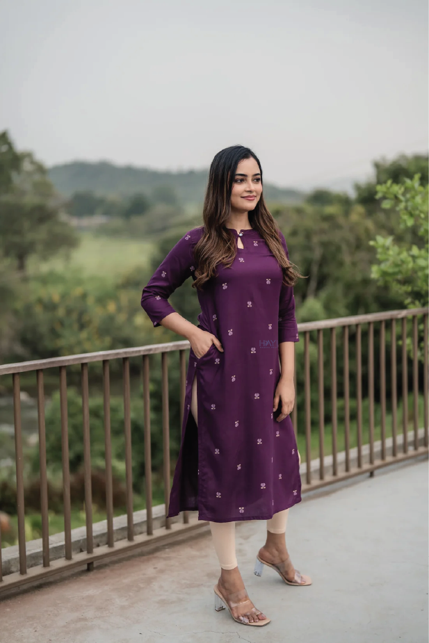A rich purple kurti exuding elegance and sophistication. The straight-cut design with three-quarter sleeves and side slits make it a versatile outfit, perfect for both formal and casual wear.